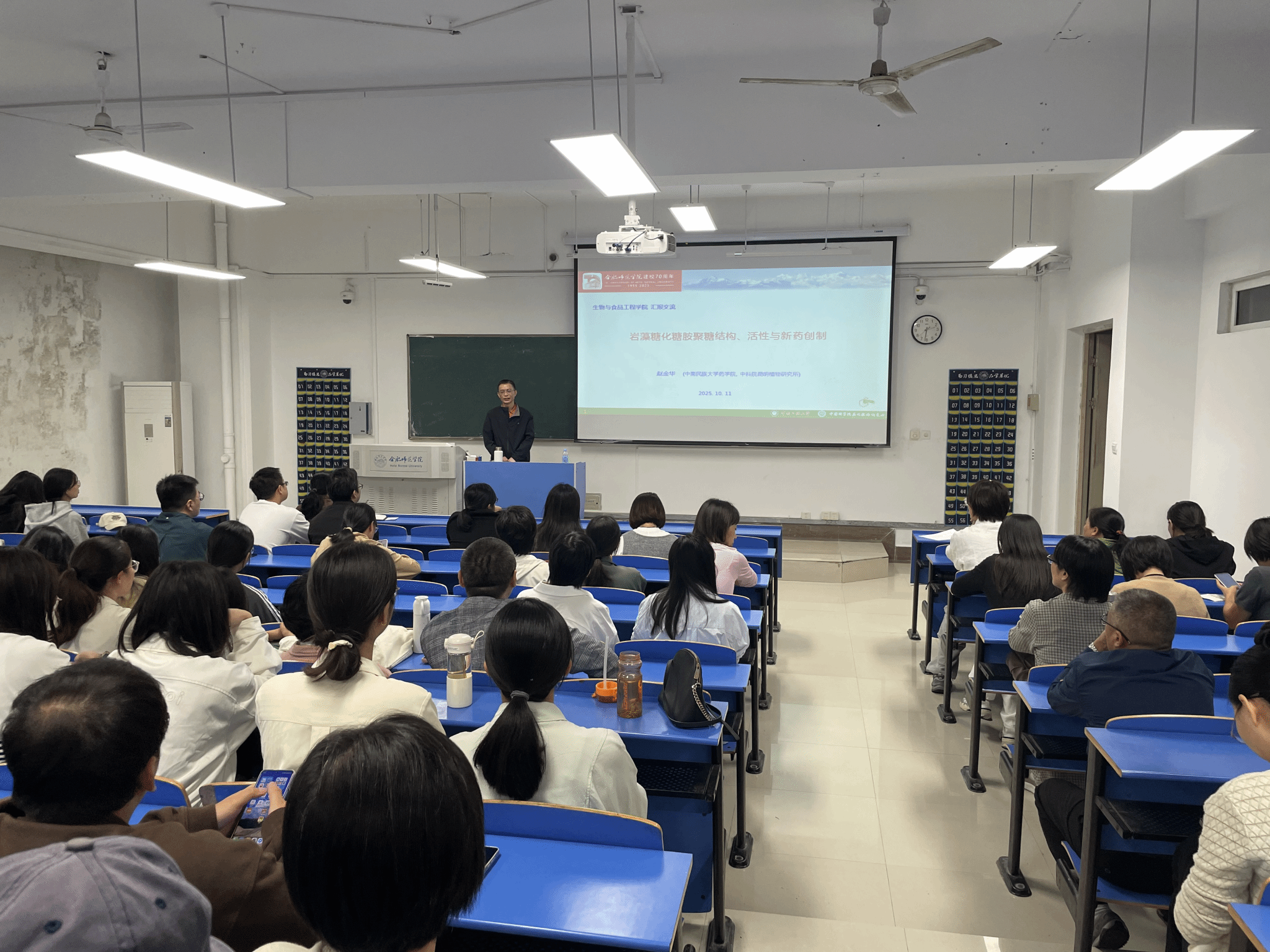 10月11日下午,我校太阳集团tyc97281990届校友赵金华,在锦绣校区逸夫楼109教室作“糖胺聚糖结构、活性与新药开发”专题报告。学院全体教师及2023级生物制药专业学生参加此次报告,现场学习前沿学术知识。