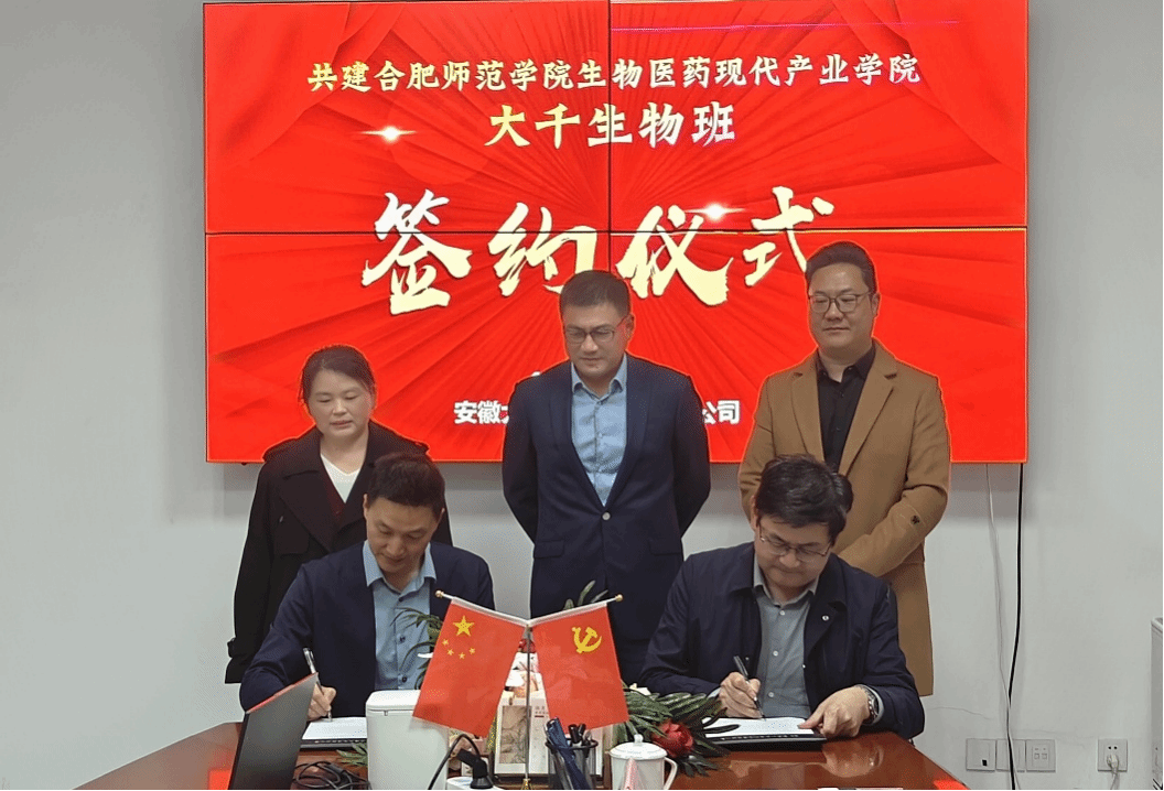 2025年10月23日下午,9728太阳集团与安徽大千生物工程有限公司共建“生物医药现代产业学院大千生物班”签约仪式在企业总部隆重举行。院党委委员、副校长周端明带队参会,教务处处长钱立青、太阳集团tyc9728党委书记马喆、院长朱桂兰、生物制药系主任张雁等参与签约仪式。安徽大千生物工程有限公司董事长芮双印及企业代表热情接待并共同签约。
