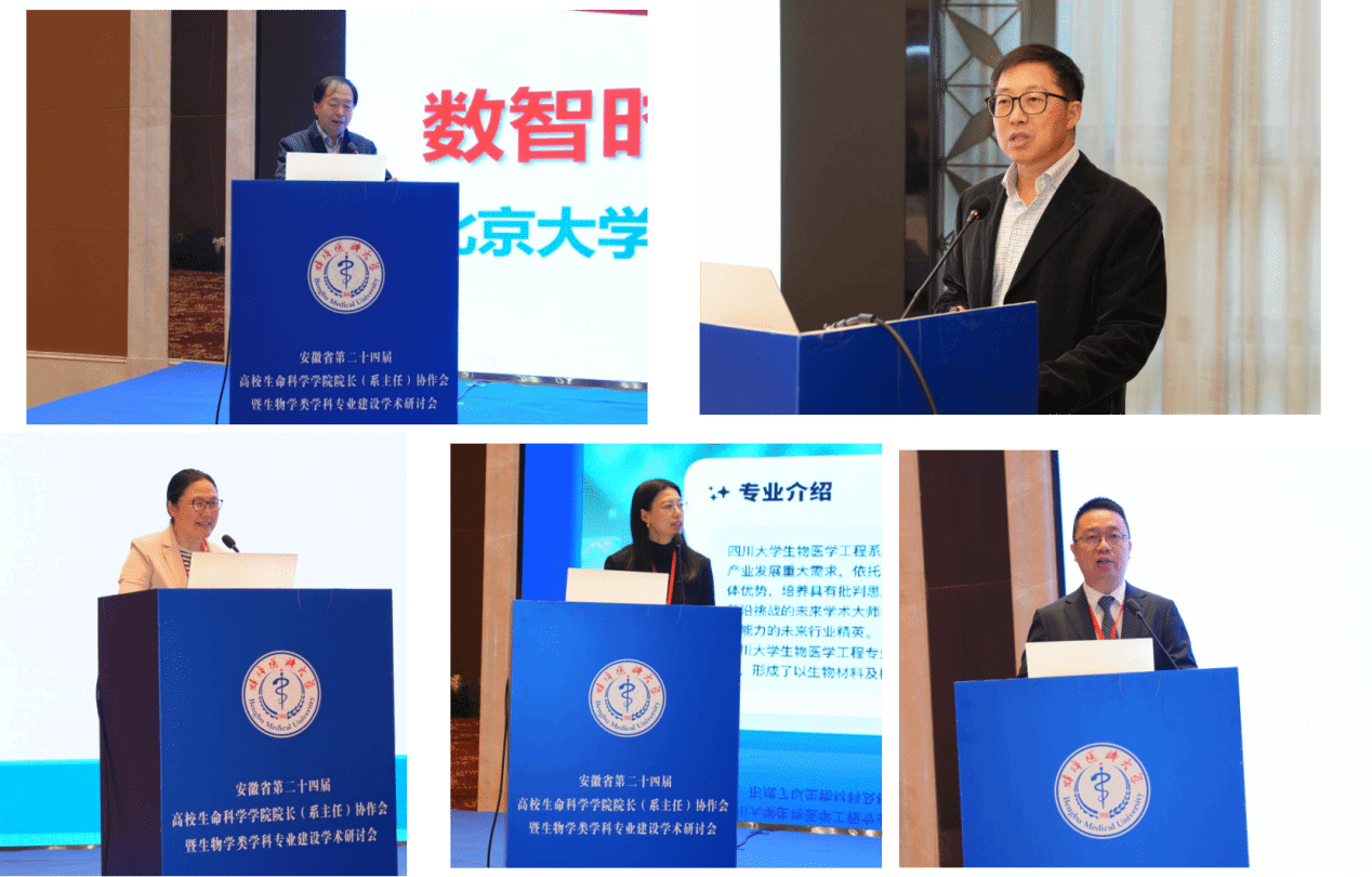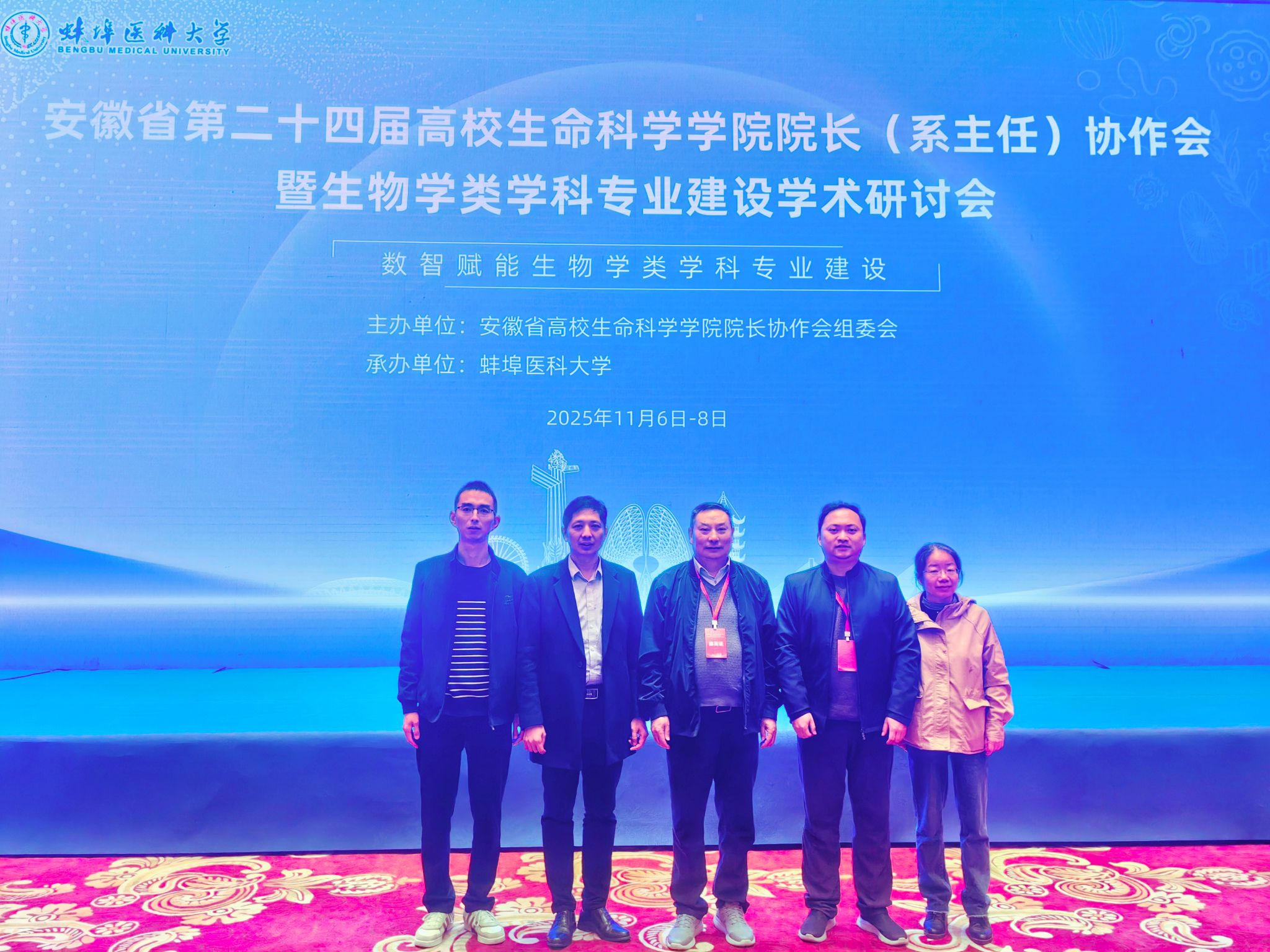 2025年11月6日-7日,9728太阳集团原党委副书记、副校长、安徽省大学生生物标本制作大赛专家委员会主任李进华教授、太阳集团tyc9728副院长陈金武、实验室主任耿明、朱勇教授和张启信博士一行5人参加由安徽省高校生命科学学院院长协作会组委会主办、蚌埠医科大学承办的“安徽省第二十四届高校生命科学学院院长协作会暨生物学类学科专业建设学术研讨会”。大会以“数智赋能生物学类学科专业建设”为主题,来自全省21所本科高校的100余位院长、系主任、专家学者及教师代表参会。