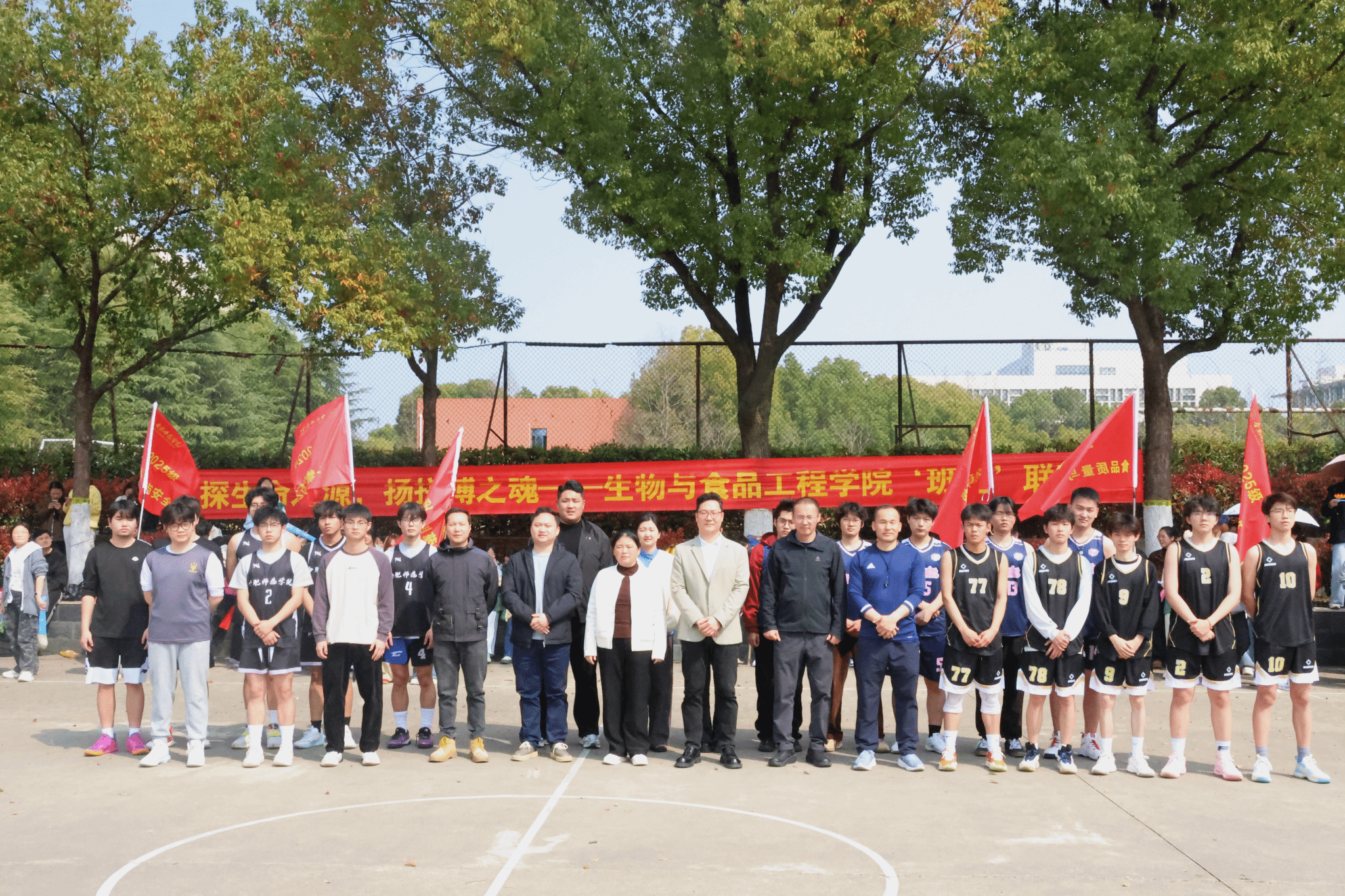 开赛哨声响起,学院党委书记马喆为揭幕战开球。身着印有班级名称与个人署名定制队服的球员们全力以赴,奔跑、跳跃、突破、投篮一气呵成,攻防转换紧凑激烈。赛场边,师生观众呐喊助威,掌声与欢呼声交织成潮,浓厚的集体氛围充分彰显班级凝聚力,生动诠释了“身上有汗、眼里有光”的育人目标。