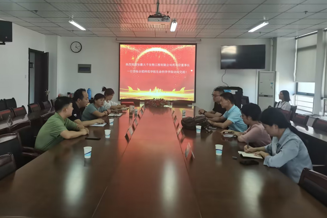 本网讯 9月19日下午,安徽大千生物有限公司董事长芮双印、总经理李燕华、总工程师陆大伟、人事经理边晓红一行来我院就校企合作、学生培养等问题展开交流。生命科学学院副院长朱桂兰、生物制药系主任王伟、实践教学部主任张雁以及相关教师代表参加活动。
