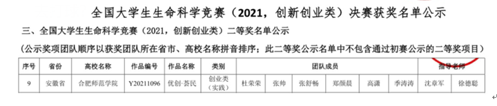 本次比赛受到校院两级领导的高度重视,生命科学学院在本届比赛开始后,积极动员部署,组织遴选项目,在大学生生命科学竞赛安徽赛区初赛中获得省级一等奖1项,二等奖4项,三等奖4项。
