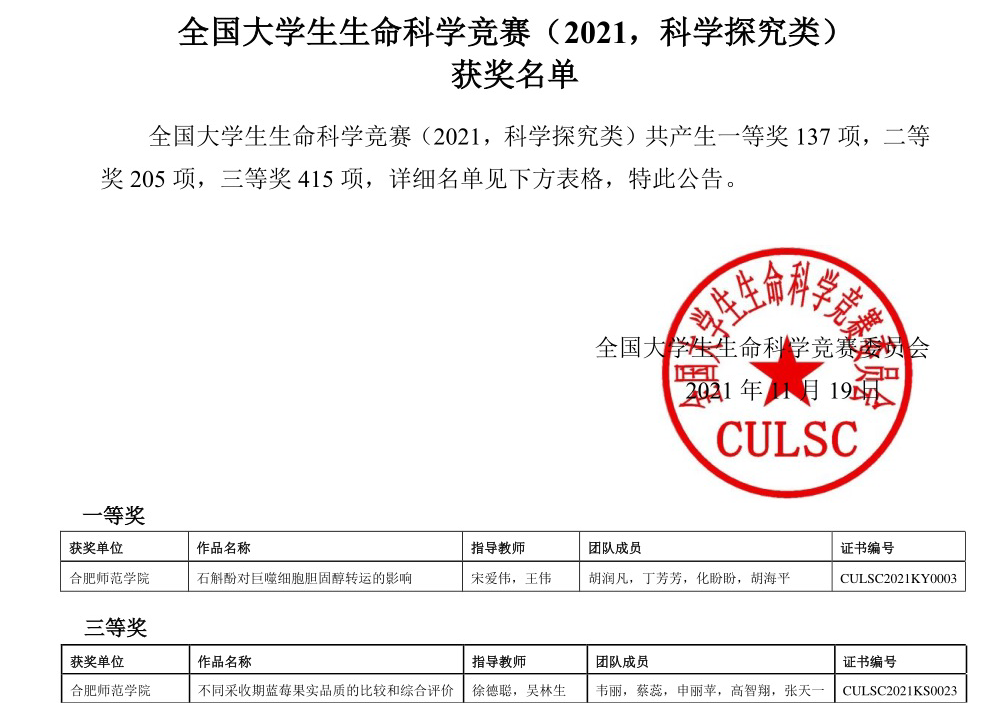 本网讯 近日,2021年全国大学生生命科学竞赛决赛落下帷幕。经过网评、省赛和国赛三个环节,由我院王伟和宋爱伟老师指导,胡润凡、丁芳芳、化盼盼和胡海平同学参加的《石斛酚对巨噬细胞胆固醇转运的影响》荣获一等奖(科学探究类国赛最高奖项);由沈章军,徐德聪老师指导,杜荣荣、张帅、张舒畅、郑颜晨、高潇和季涛涛同学参加的《优创·荟民》荣获二等奖(创新创业类);由徐德聪,吴林生老师指导,韦丽、蔡蕊、申丽苹、高智翔和张天一同学参加的《不同采收期蓝莓果实品质的比较和综合评价》获得三等奖(科学探究类)。取得我院参加全国大学生生命科学竞赛以来历史最好成绩,生科学子再一次用知识和智慧交出了一份靓丽答卷。