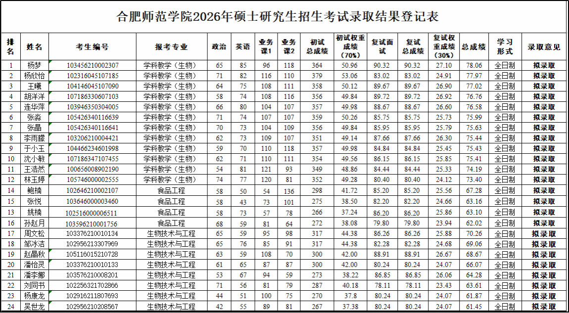 2026年硕士研究生招生(调剂)拟录取结果: