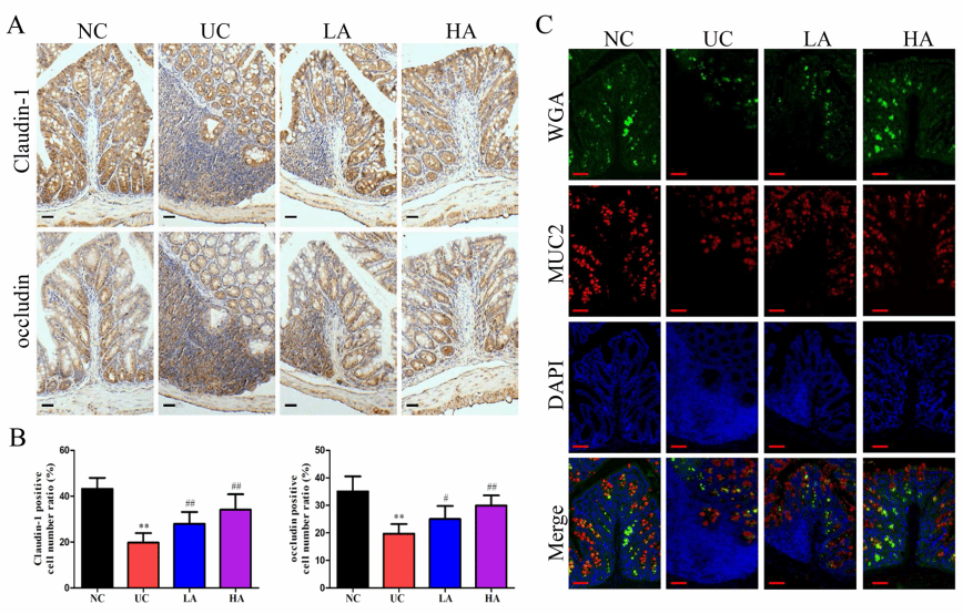 溃疡性结肠炎(UC)属于炎症性肠病(IBD)的一种,是一种病因尚不十分清楚的结肠和直肠慢性非特异性炎症性疾病。亮菌,又称假蜜环菌,其菌丝体中含有的多糖成分具有较好的抗炎作用。然而,亮菌菌丝体多糖(AT)对UC的影响尚未阐明。研究人员利用葡聚糖硫酸钠(DSS)建立UC小鼠模型,分别给予低、高剂量的AT进行灌胃干预。发现AT改善了UC小鼠的一般症状、减轻小鼠结肠的氧化应激和炎症反应。AT干预还可以改善UC小鼠结肠组织中紧密连接蛋白Claudin-1和occludin的表达,并上调结肠组织黏蛋白的表达,促进了结肠屏障功能的恢复。