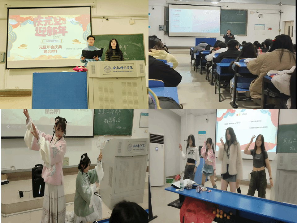 在辅导员老师和班干部的精心策划和组织下,各专业晚会精彩纷呈,节目形式多样,涵盖了歌唱、舞蹈、乐器演奏、相声、小游戏等节目,同学们用精彩的表演向大家展现了青春的活力和对新一年的美好祝愿。辅导员周其松演唱的开场歌曲《我的纸飞机》将现场气氛瞬间点燃,祝福每一位同学都有一只纸飞机指引未来前行之路,照亮美好人生。《霜雪千年》《彩虹》《11》等一首首动人的歌曲唱出了同学们的青春无限,《起风了》《中国舞》等一支支动感的舞蹈舞出了同学们的活力十足,相声《败家子》和《你比我猜》《幸运大转盘》等各种互动小游戏逗得大家笑声不断,现场气氛热烈,同学们无不洋溢在喜迎新年的喜悦中。青春就是无与伦比的舞蹈,舞出美好年华!