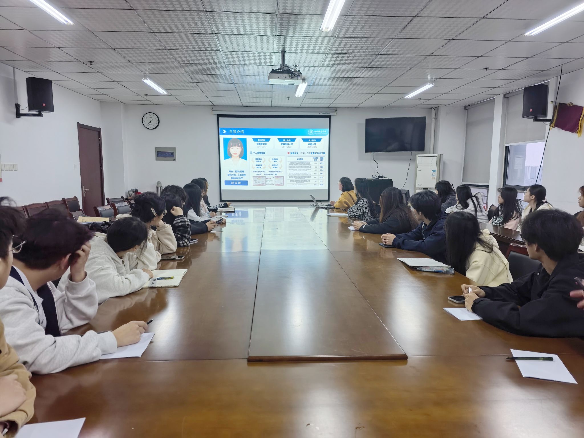 4月23日下午,太阳集团tyc9728第五期“教授博士有约”活动在行知楼1502会议室举行。活动以“党建+思想引领”为导向,特邀生物制药教研室赵天娇博士主讲,2025级辅导员、校悦历生涯工作室负责人梁悦主持,40余名学生参与交流。