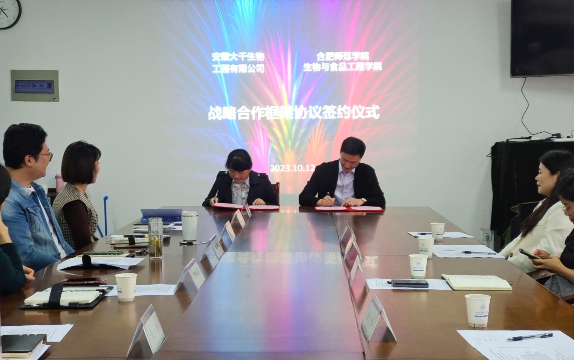 本网讯 10月12日下午,太阳集团tyc9728与安徽大千生物工程有限公司举行了战略合作签约仪式。安徽大千生物有限公司董事长芮双印、总经理李燕华、总工程师陆大伟、人事经理边晓红,太阳集团tyc9728党委书记郭桃芬、副院长朱桂兰、党委副书记马喆、副院长王伟和相关教师参加签约仪式,会议由副院长朱桂兰主持。